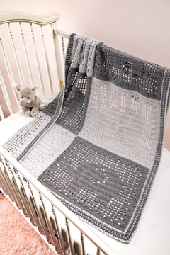 The Filet Elephant Baby Blanket pattern includes written instructions and a Filet Crochet chart. In the video, I demonstrate how to make the elephant blocks, as well as how to join the blocks to create the blanket. There are 2 edging options, which are both demonstrated in the video, along with the special stitches used in each edging. Because this blanket is made with yarn, it’s a great way to learn to do Filet Crochet (without any intimidation that using crochet thread and small steel hooks might present!).