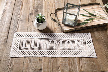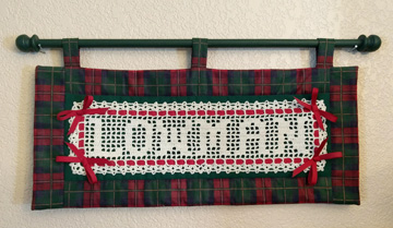 You can get creative with how you’ll use your Filet Name Banner. You may want to use it as is or mount it in some way. To give you an idea of how you may want to mount your banner, here’s a photo of another Filet Name Banner that I crocheted many years ago showing how I mounted the filet piece on some fabric and hung it on the wall with a painted wooden dowel: