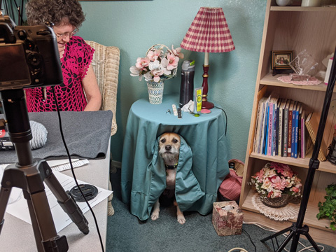Every good venture needs a mascot, right? Well, here’s our mascot, Maggie, who usually lays down either under the side table covering or behind my chair while we’re working on videos. She just loves being with us and is so quiet in the video room! She’s come a long way since we brought her home almost 5 years ago! She used to chew a lot of things and very rarely does she chew anything of ours now.