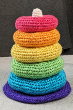 All this to say, that in 2016, I designed a crocheted baby toy for stacking baby rings. Life got busy and I never published that pattern (okay, I’m a procrastinator and a perfectionist, too, which doesn’t help!!!). This crochet toy is like the plastic ones that Fisher Price made back in the day, and still does. I’ve always liked this fun toy for babies, probably because it’s made with rainbow colors and I LOVE rainbow colors! So without further ado, here is my newest crochet pattern, “Stacking Baby Rings”. Each ring is made with a different color. All 5 rings stack (in the correct order) onto the cone that is attached to the base. The rings, as well as the cone, are stuffed with fiberfill. Each piece is crocheted with basic crochet stitches: chains, single crochet, sc increases and sc decreases. They’re easy to crochet (even for an adventurous beginner) and fun to see come together into a beautiful tower of color!