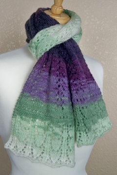 This pattern is written and charted. It is started at the center back with a provisional cast on and worked to one end. Then the 2nd half is worked from the live stitches of the provisional cast on to the other end. The lace scarf is worked mostly in stockinette stitch with garter stitch on the left and right edges to minimize curling.