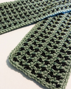 Note: Photographed models made with Caron Simply Soft yarn in #9508 Charcoal Heather and #9503 Woodland Heather. Each scarf takes approx. 3.5 – 4.5 oz of yarn total. One skein of each color should yield 2 scarves, depending on the size made.