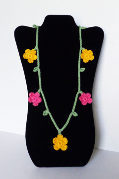 This Vine Necklace is just the answer for embellishing any outfit. Using size 3 crochet thread, it works up quickly and adds a bit of “whimsy” to your day! Crochet all 3 chains of only the flower chain with any colors you desire!