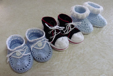Anyway, back to my story about crochet. I can’t remember the first thing I crocheted, but I know that soon after learning to crochet, I started crocheting doilies and anything with crochet thread. As I remember it, I think there were several reasons for this. One reason was that doilies usually change instructions in each round or two, which helps to keep my interest in the pattern (plus I think doilies are beautiful!). Another reason is that I’m somewhat of a “frugal” person and crochet thread isn’t that expensive! I could crochet several doilies for just a few dollars and that beat the price of many skeins of yarn to crochet an afghan! Don’t get me wrong, though. I also love to crochet afghans because they’re so useful and make excellent gifts! Speaking of gifts, I just finished crocheting 3 pairs of baby booties to be given as gifts for 2 people’s babies this month. Here they are: