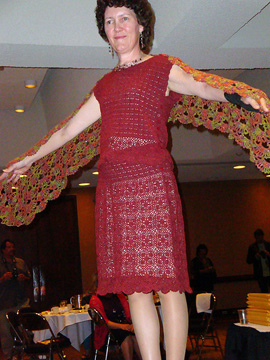 Anyway, the next addition to my crochet career came when some of my class proposals were accepted for me to teach at the CGOA Conference in 2009. I remember that like it was yesterday! My middle son got married in June, 2009 and the conference was at the end of July. A few weeks before the conference, my husband and I were taking a nature walk nearby and he was taking photos. I had my camera in my hand and before I knew it, I slipped on loose gravel, fell down and broke my left wrist! I couldn’t believe it! How could this happen before I was scheduled to teach at the conference? Would I still be able to teach my classes? Well, the following week, I had surgery to repair my broken wrist. My husband printed and bound the rest of my class handouts and was a HUGE help! So my classes didn’t have to be cancelled after all! With my left arm in a sling, my bags were all packed and I headed to the airport, where I got lots of help with my luggage! Once inside the terminal, I took one look at the escalator (with my arm in the sling) and turned around to find the elevator instead (I couldn’t hold onto the handrail and my carry-on bag with the same hand!). I taught 4 classes at the 2009 conference in Buffalo, NY with lots of help from some wonderful crocheters in my classes (and from Jean Leinhauser, too)! I even did my best to teach my shuttle tatting class to my students “one-handed”!!! I have many fond memories from that conference. My roommate even helped me with some of the “logistics” of getting dressed with one good hand, including how to put on jewelry one-handed! I even modeled the top and skirt that I crocheted to wear at my son’s wedding in the fashion show at the conference that year! I have a few photos that I’d like to share from that conference.