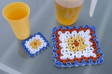 The first is our WIGGLY FLOWER HOT PAD & COASTER. This set is made in the wiggly crochet technique with size 10 cotton crochet thread. The hot pad is made with 3 strands of the thread and the coaster is made with only one strand.