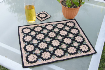 The second is our BYZANTINE PLACEMAT & COASTER. This set is made with any 2 colors of size 3 cotton crochet thread. The placemat is made with large and small motifs, which are joined together while working the last round of each motif. Then an edging is worked around the joined motifs for the perfect finish. The coaster is made from only one of the large, round motifs, with an edging added to make it square.